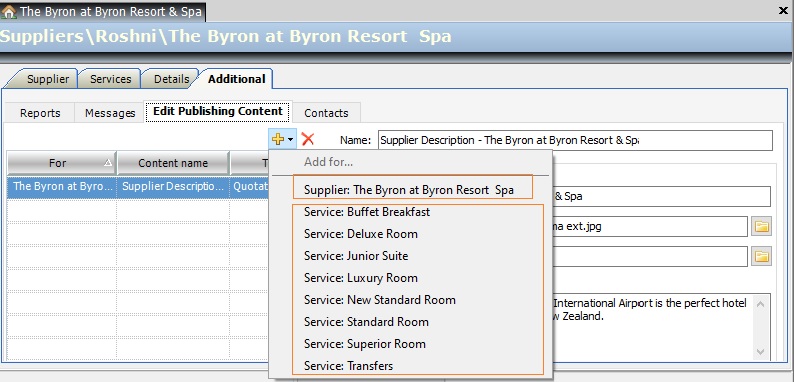 Tip: For supplier level content start with ‘Supplier Description:’ (e.g. Supplier Description: Pullman Auckland) so all supplier descriptions are ordered together within the content chooser.