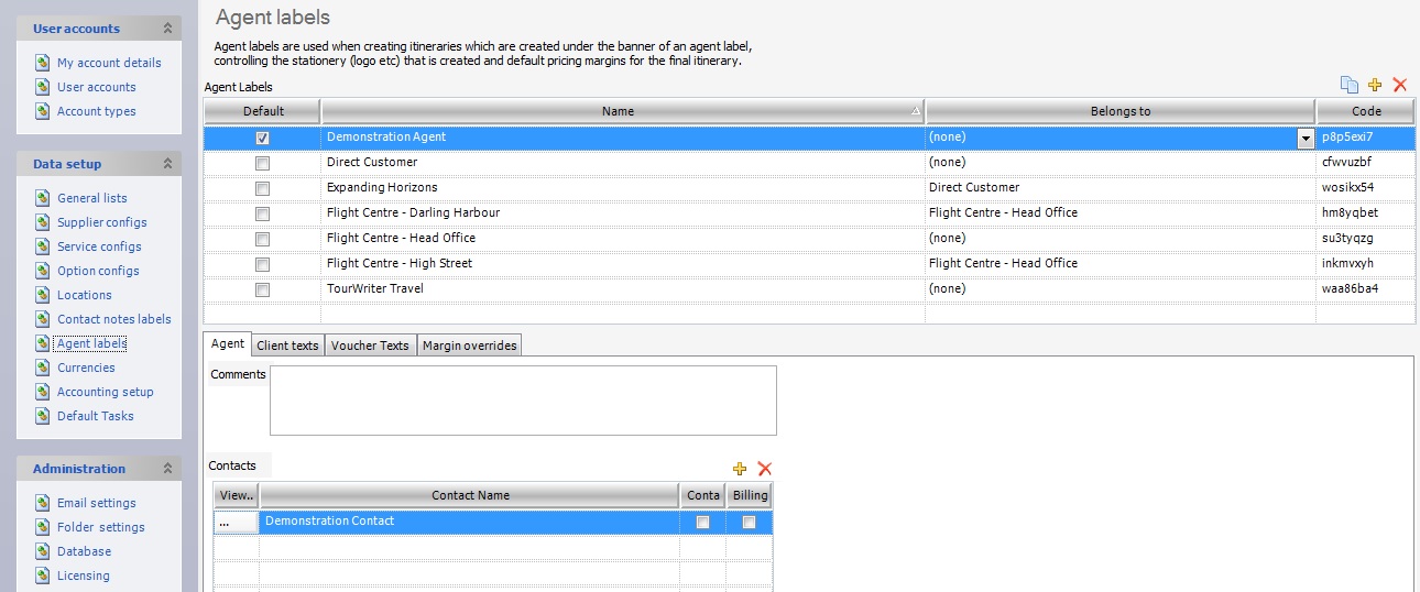 Agent labels are used to assign an Agent (e.g. parent company, overseas agent referrals, direct customer etc) to an Itinerary. This is useful when itineraries are created under the banner of another agent, allowing control over stationery (for example, the logo, header and footer text to be inserted on supplier and client correspondence and documentation) and pricing margins. When an agent is selected on the Itinerary Tab, the agent commission, or markup information loaded here, will automatically be inserted into the pricing area within the bookings list and the logo for that agent will appear on documentation, such as vouchers.
