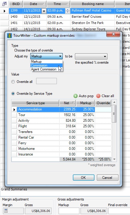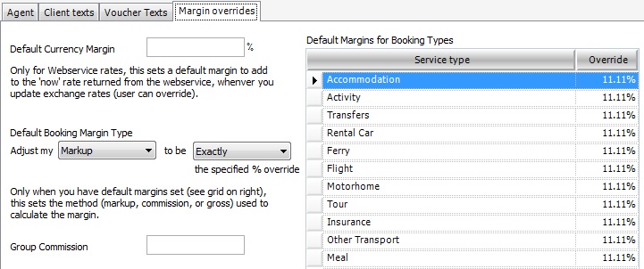 - In the Default Margins for Booking Types adjacent workspace populate or amend the Override field for each Service Type accordingly. These amounts will then either be your Markup percentage or your commission percentage depending on what you have selected as your Default Booking Margin Type (i.e. Markup or Commission).