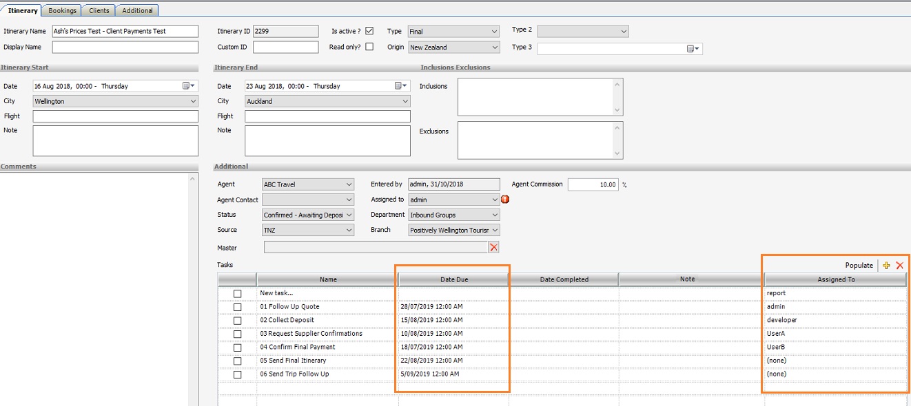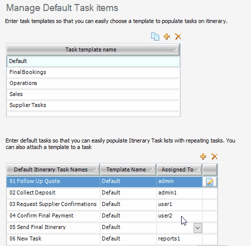 Note: When populated to the itinerary, the Tasks are assigned the default assignees set in the Setup area. Tasks can however be assigned to different users once added to the itinerary.