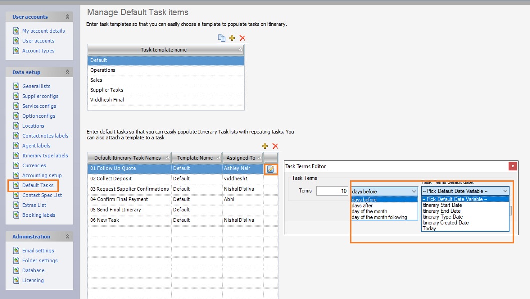 The Default Tasks feature now lets you assign a task to a Travelmesh user. The feature allows you to associate a time-frame to the task and lets you pick a task’s due date based on options. The “Task Term Editor” is available under Tools > Setup > Default Tasks. You can assign a term to a task based on a list of drop-down values.