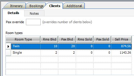 Use the Room Types table on the Clients tab to populate your Rooms Bkd and Pax Bkd ready to make provisional bookings on your Bookings List.