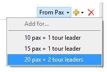 - You can set up just one Pax break, or several, depending on the needs of your agent or client. Repeat steps 3 and 4 to add additional Pax Breaks. As the group size increases, you can increase the number of Staff as shown below: