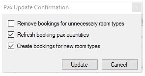 The Bookings List will now contain bookings for new room types/child options, and the booking quantities will be recalculated based on the new values entered in the Pax breaks screen. The Date, Time, Nts (if applicable) and Qty will be copied from the default booking. For example if you have a Twin (default) and Single room in the Bookings List and use the Pax Updater to add a Triple room to all Accommodation bookings, the Date, Times, Nts and Qty will be copied from the Twin room of the existing Accommodation bookings.