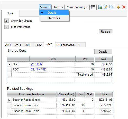 FOCs are based on the total of all rooms for this booking. In the Related Bookings section, you will see a total of 23 rooms quoted across all Pax and Staff. Based on the Supplier’s FOC policy for this Service, we are entitled to 1 free Service worth $158 Nett, which is then shared between the 40 paying passengers (Pax) for this Pax break. $3.95 is therefore deducted from each paying passenger’s price.