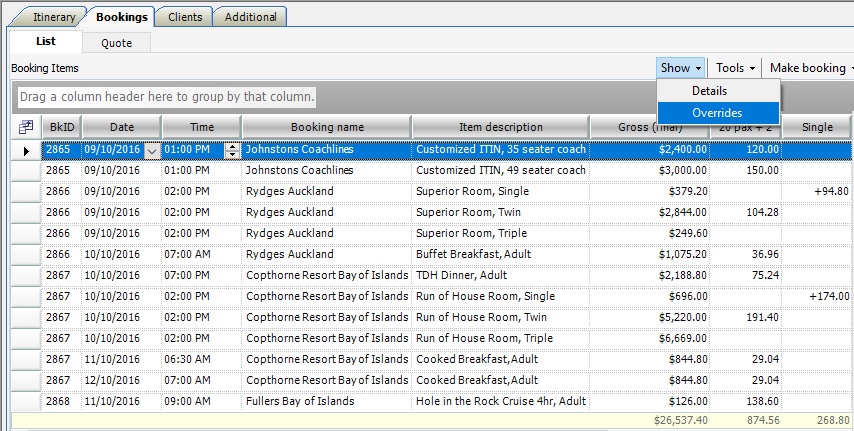 To show the Overrides along the bottom of the Bookings List, select Show > Overrides