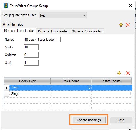 As adjustments are made to the Pax breaks, i.e. adding or removing Room Types, changing Pax and Staff quantities or adding Children, select Update Bookings on the Travelmesh Pax breaks screen: