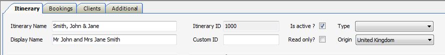 This field allows the client to differentiate/customise itineraries. The list is customisable in Tools > Setup > General Lists > Itinerary types. List values (i.e.options) could be Package, Sale, Group, FIT, Guided, Self Drive.