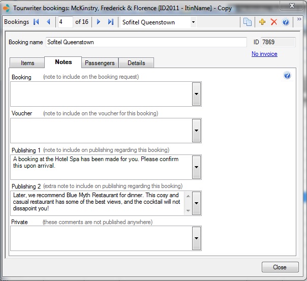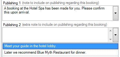 - Then, whenever you pull a Service into your booking, you can simply, open the Travelmesh Bookings window (by double clicking on a booking line), click on the Notes Tab and click the downward arrow beside either the Publishing 1 field or the Publishing 2 field, which will allow you to select a saved quick-note.