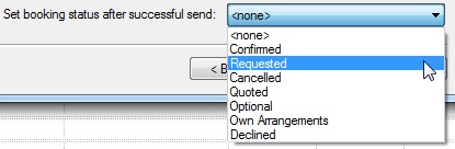 8. Before sending, you can Set a Booking status, by selecting the Booking status you require from the drop-down options offered at the bottom right of this screen (next to Set booking status after successful send:). For example, you could switch your Booking status from <none> to Requested.