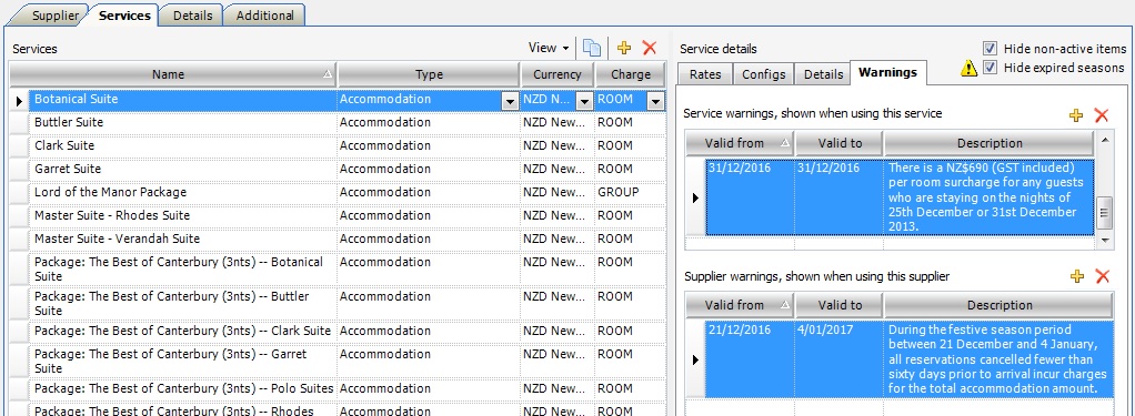 This is where specific Service and/or Supplier information can be entered as Warnings across a certain date range. The purpose of loading warnings is to alert the user that the Service or Supplier may not be an appropriate option. Applicable warning messages (once loaded) will pop up when the Service or Supplier is dragged and dropped into an itinerary.