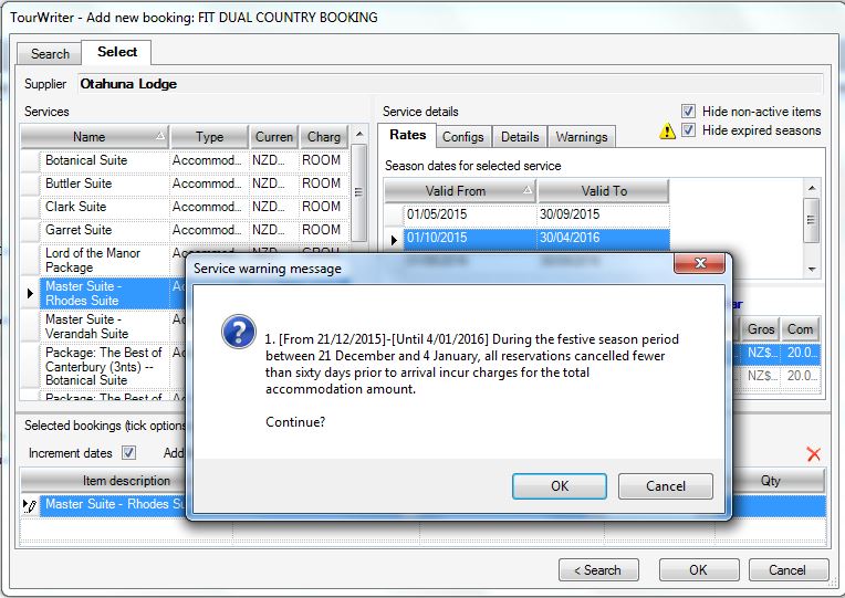 Applicable warning messages will pop up should the Service or Supplier be dragged and dropped into an Itinerary.