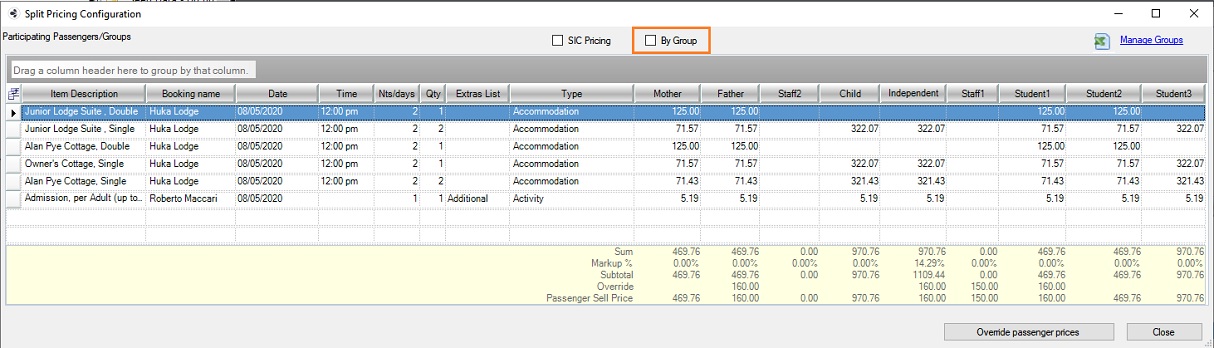 - The window initially pops up to display booking prices per group. Untick the By Group checkbox to view booking prices per passenger.