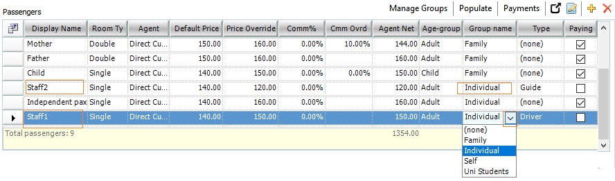 - Select the passenger type under the Type field. It is important to assign a relevant type to a Staff passenger, e.g. Driver, Guide. A Staff’s cost is split among all itinerary passengers only after selecting the correct Type value and unticking the Paying checkbox against them.