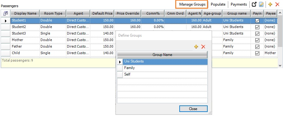 - Click Manage Groups at the top-right of the Passengers workspace to open the Define Groups window. The option to open the Define Groups window is also available on the Split pricing window.