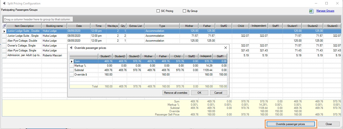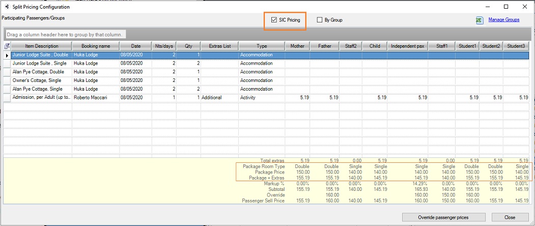 The Split configuration window lets you alter your itinerary pricing view between pricing per traveller or group. You can also use this window to override passenger prices. A non-SIC itinerary is known as Pure Split tour.