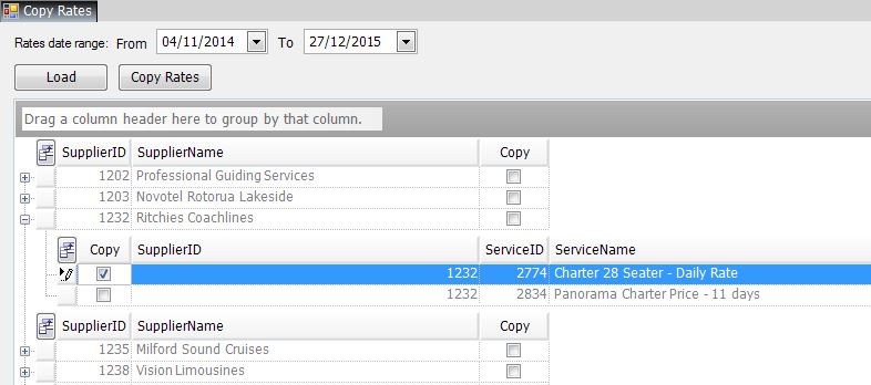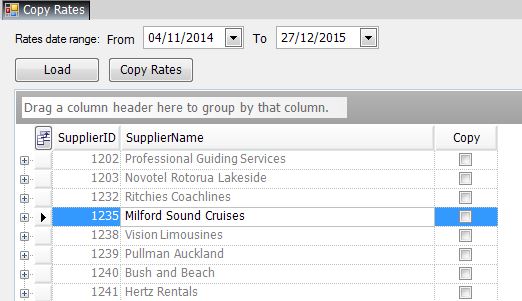 NOTE – Travelmesh will still load a season if a season start date equals the To date. The Rates date range From and To fields default to the current calendar year; click the Load button if the default dates are suitable or manually define a different date range and then click the Load button. - Locate the Supplier/s that will be copied (use the scroll bar on the far right).