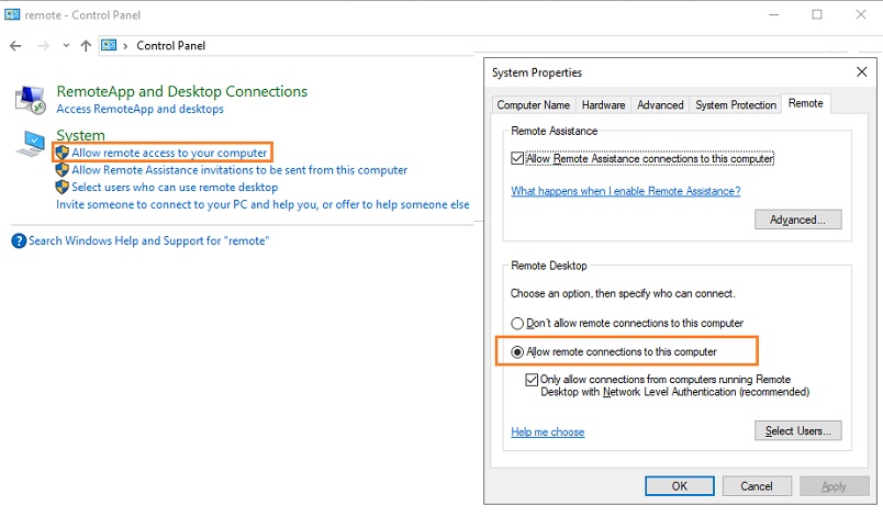 • On Windows, go to the Control Panel. Navigate to System and Security. And under System, select Allow remote access.